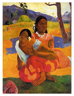 When will you marry? (Tahitian: Nafea faa ipoipo?) 1892 "... the front figure indulges in dreamy fantasies, the rear figure is imbued with something rigid and rule-bound. The front woman stretches herself, her facial features stylized and simplified. The rear female figure ... face is painted with individual features and represents the center of the image. ..." I sometimes (almost always???) think that art academics get carried away... To me, as a painter, and with a son and daughter, this could more basic; there is mom, or aunt, and daughter; daughter looks like daughter, mom looks like mom, neither of them really are sure they want to be sitting there getting painted. Gauguin apparently was very mercurial, full of ups and downs, maybe mostly downs. Many of his pictures seem to reflect Gauguin, in this way; not necessarily those being painted. | Tahitian Women on the Beach Two Tahitian Women | |||